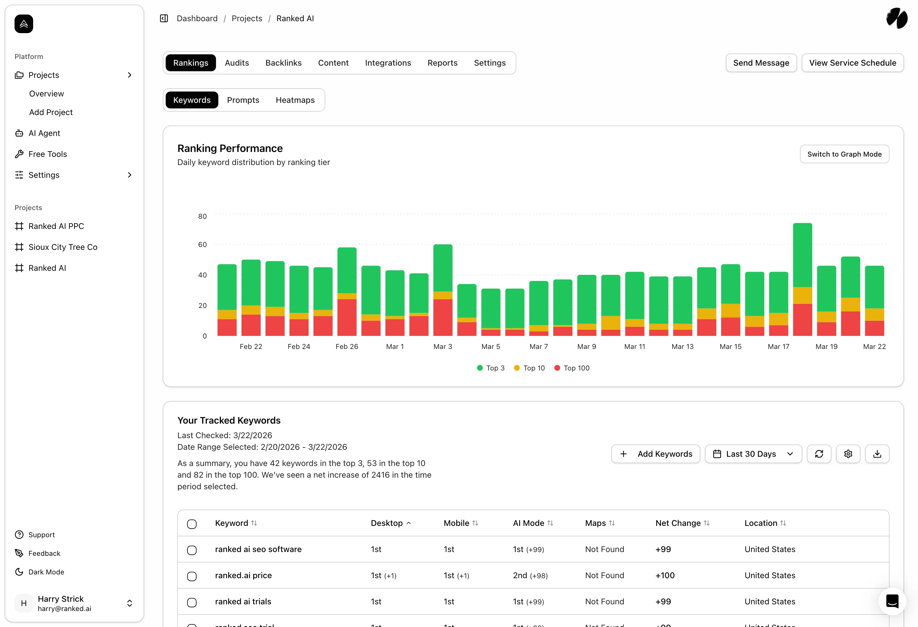 We specialize in AI SEO. Get full clarity on your AI visibility and have it fully managed for you. Over 5000 businesses trust Ranked AI to rank them on AI search. Starting at $99/mo.